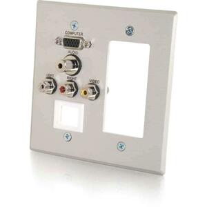 C2G VGA, 3.5mm Audio, Composite Video and RCA Stereo Audio Pass Through Double Gang Wall Plate with One Decorative Style Cutout and One Keystone – Brushed Aluminum